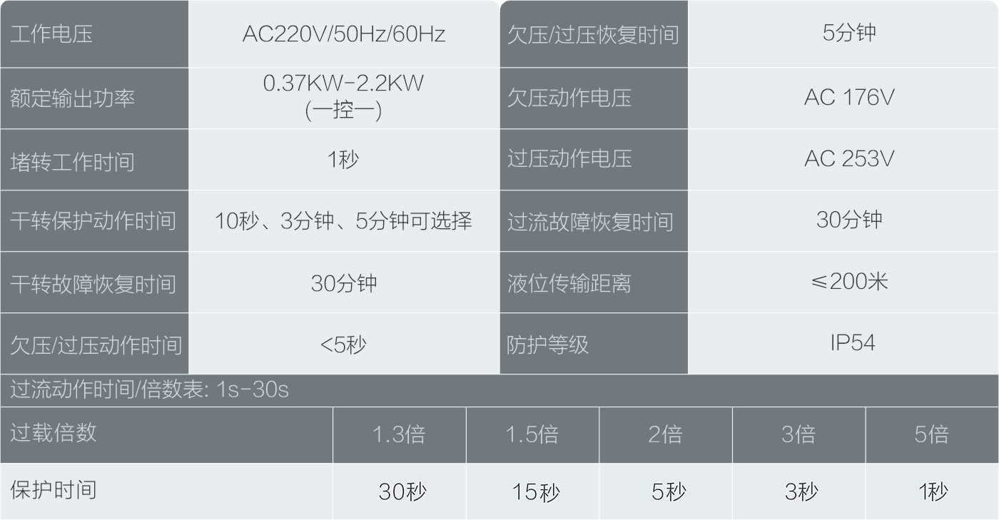 1.適用于0.37-2.2KW直接啟動的單相深井泵、管道泵等的自動液位、壓力控制及保護(hù);