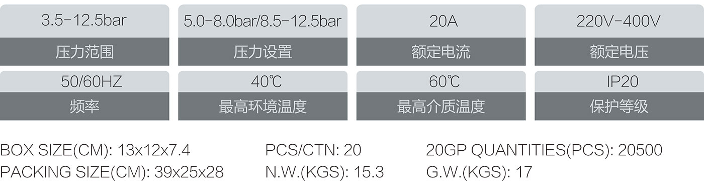 1.用于空壓機的壓力開關. 2.根據(jù)設定的壓力自動開啟和關閉空壓機. 3.螺紋接口可選擇:1/4或3/8“內(nèi)螺紋,活接 4.延遲關閉系統(tǒng)的空氣釋放閥