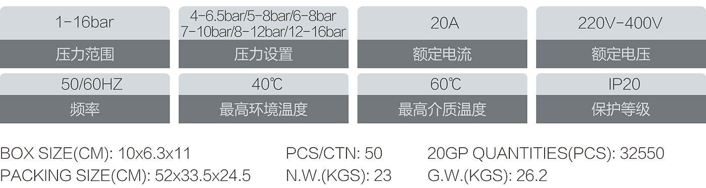 1.用于水系統(tǒng)的壓力開(kāi)關(guān). 2.根據(jù)設(shè)定的壓力自動(dòng)開(kāi)啟和關(guān)閉水泵. 3.螺紋接口可選擇:1/4" 3/8" 1/2"內(nèi)螺紋,單通或雙通.