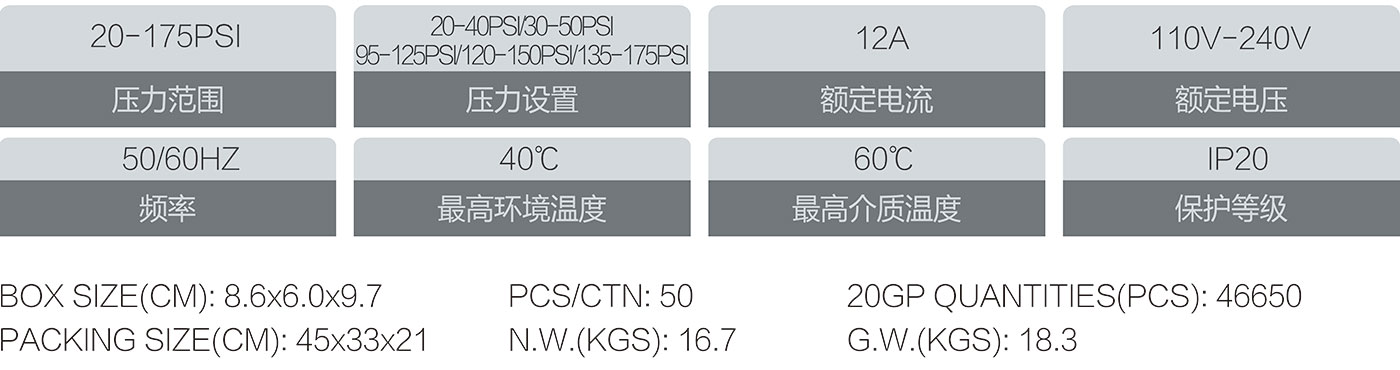 1.用于水系統(tǒng)的壓力開關. 2.根據(jù)設定的壓力自動開啟和關閉水泵. 3.螺紋接口可選擇:1/4"外螺紋,內(nèi)螺紋,3/8"內(nèi)螺紋