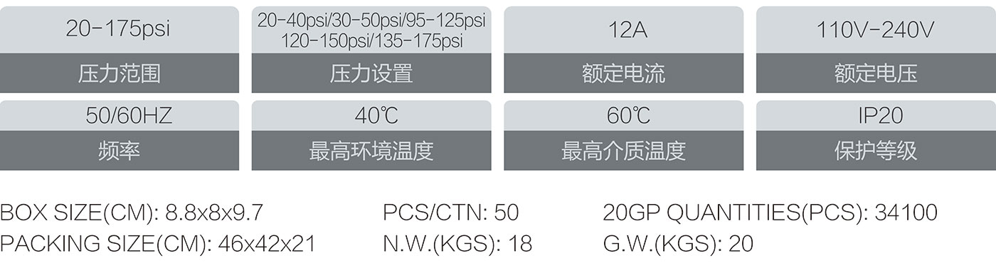 1.用于空壓機的壓力開關(guān). 2.根據(jù)設(shè)定的壓力自動開啟和關(guān)閉空壓機. 3.螺紋接口可選擇:1/4"外螺紋或內(nèi)螺紋,單通或四通. 4.延遲關(guān)閉系統(tǒng)的空氣釋放閥.